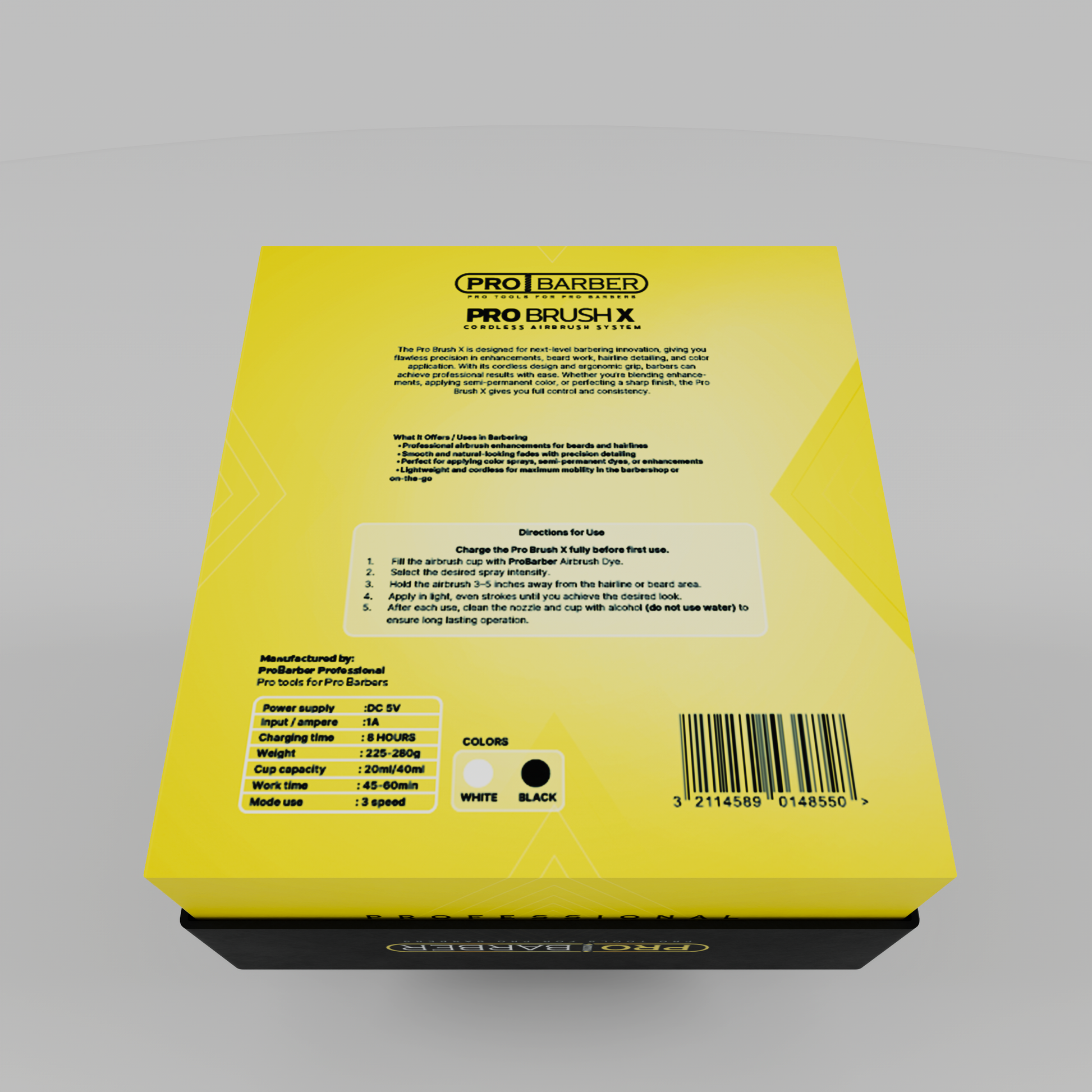 Whether you're creating sharp airbrush lines, applying semi-permanent dye, perfecting beard enhancements, or adding finishing details, the Pro Brush X gives you mobility, power, and accuracy in one professional tool. Lightweight, cordless, and built for daily barbershop use — this is the airbrush every modern barber needs.